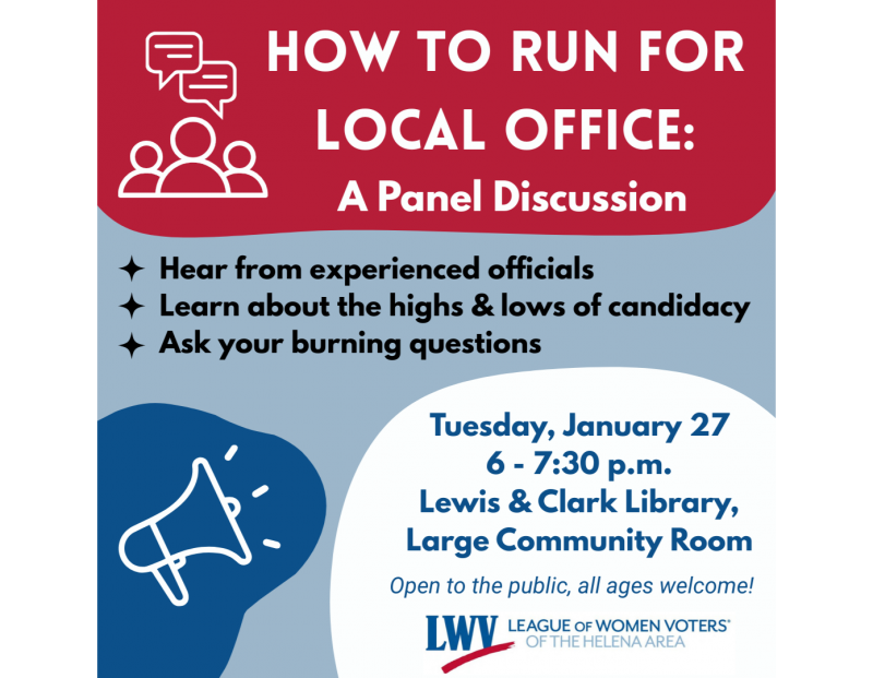 Join the League of Women Voters of the Helena Area for a panel discussion on how to run for local office, featuring a former city commissioner and current local elected officials who have experienced candidacy first-hand. Panelists will answer prepared questions and then engage in audience Q and A.