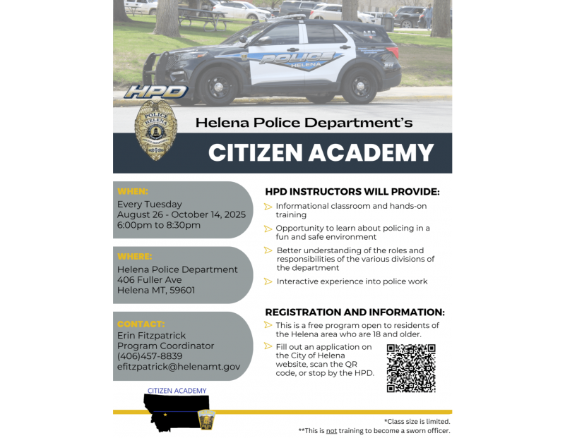 The Helena Police Department's Citizen Academy is a free program open to residents of the Helena area who are 18 and older. The intention of the program is to provide an opportunity to learn about the HPD and what it takes to be an officer. Classes run every Tuesday night, 6:00pm to 8:30pm, for eight weeks starting on August 26th. Anyone interested can visit the City of Helena website or scan the QR code on the flyer to submit an application. Direct questions to Erin Fitzpatrick at efitzpatrick@helenamt.gov.